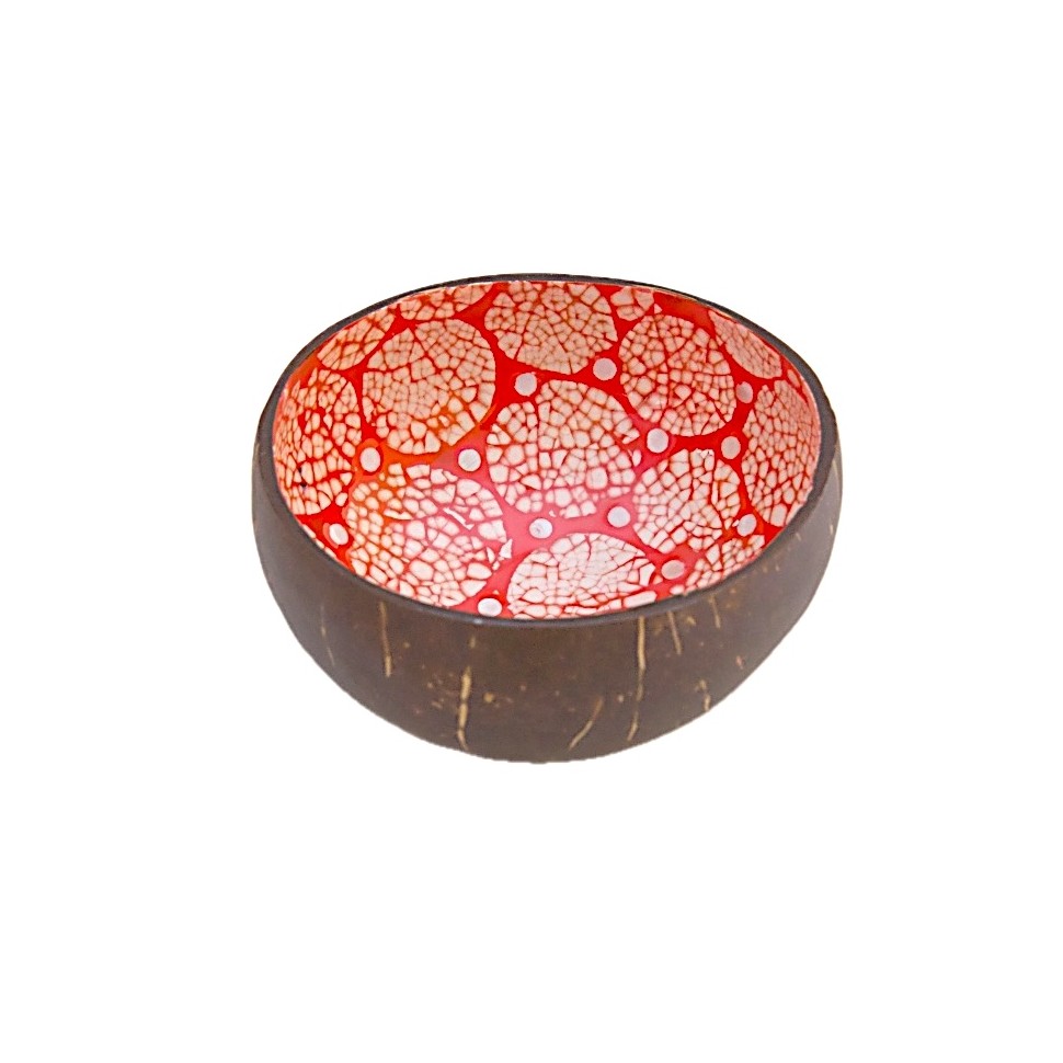 Bol en coco avec incrustations en coquilles d'oeuf et nacre laqué. Diamètre : 13 cm - Hauteur 5 cm. Différentes couleurs.