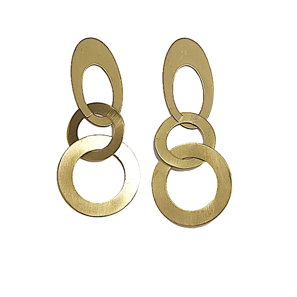 Boucles d'oreilles en laiton doré 3 formes géométriques imbriquées. Longueur : 7 cm.