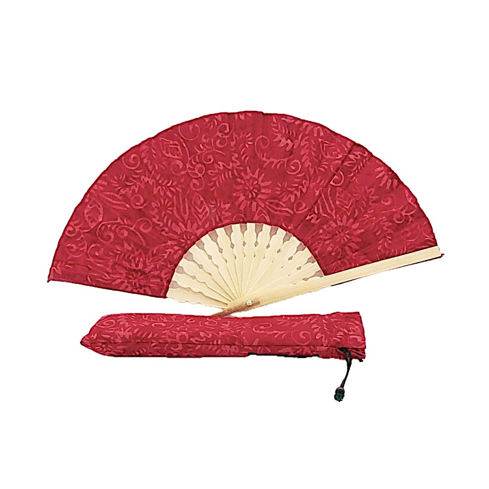 Eventail en bambou et coton rouge et son étui matelassé assorti. Diamètre éventail : 20 cm