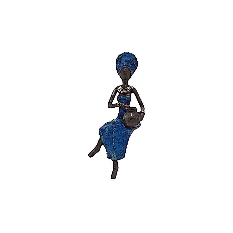Femme élégante en bronze vêtue de bleu avec amphore fabriquée par Soré. Hauteur : environ 15 cm.